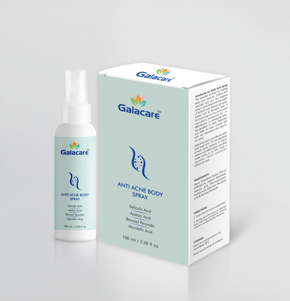 Galacare Anti-Acne Spray: A targeted solution for acne-prone skin, this spray is designed to effectively combat breakouts. Formulated with active ingredients like salicylic acid or benzoyl peroxide, it penetrates deep into pores to unclog them, reduce inflammation, and kill acne-causing bacteria. The convenient spray format makes application easy and convenient, while the gentle formula helps soothe and calm irritated skin. Suitable for all skin types, Galacare Anti-Acne Spray promotes clearer, healthier-looking skin with regular use.