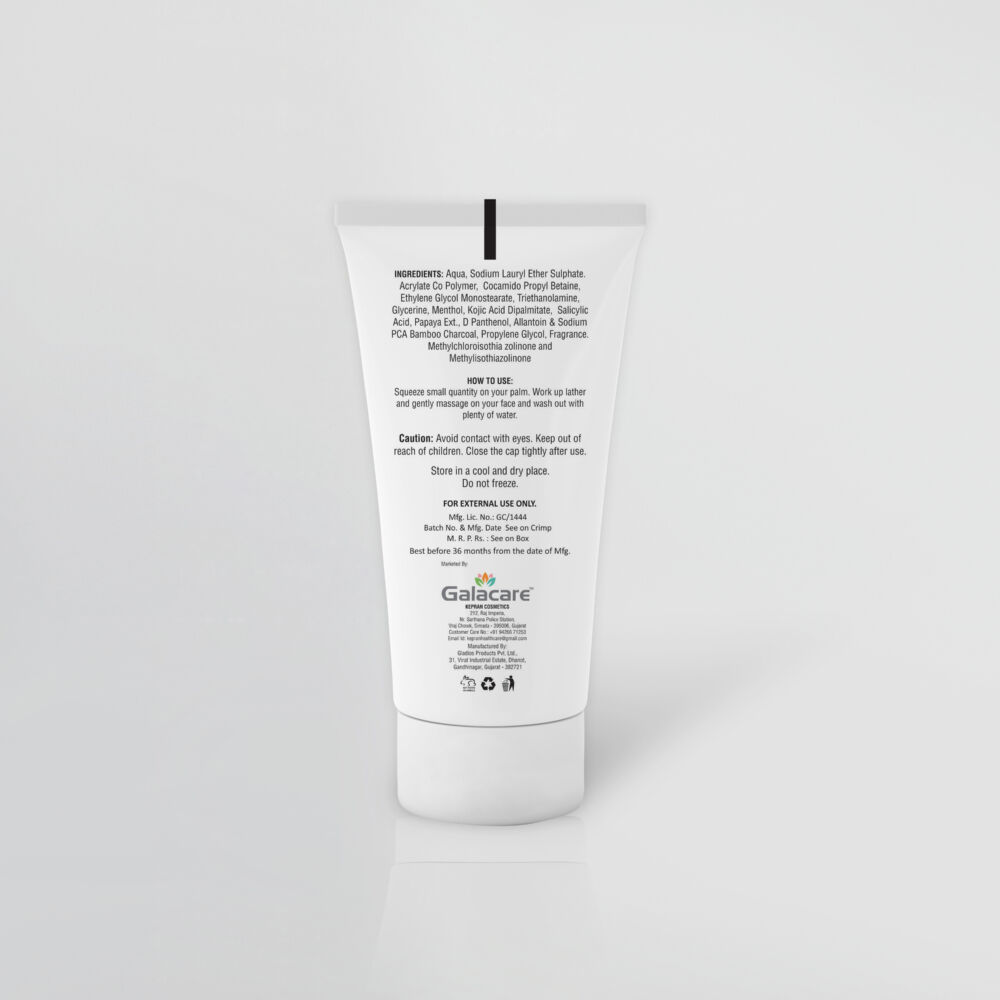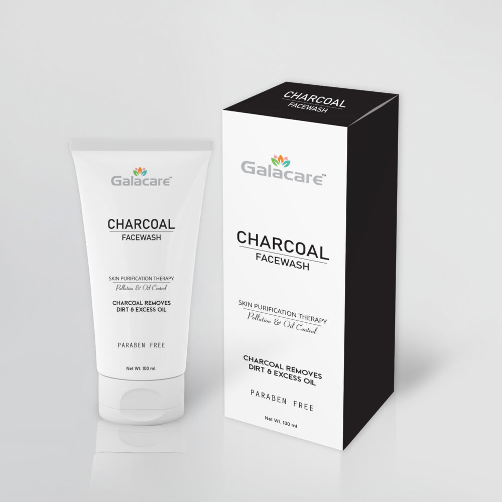 Galacare Charcoal Facewash Gel deeply cleanses and detoxifies the skin by drawing out impurities and excess oil with activated charcoal. It unclogs pores, controls shine, prevents acne, and gently exfoliates for a brighter, smoother complexion, making it ideal for all skin types.